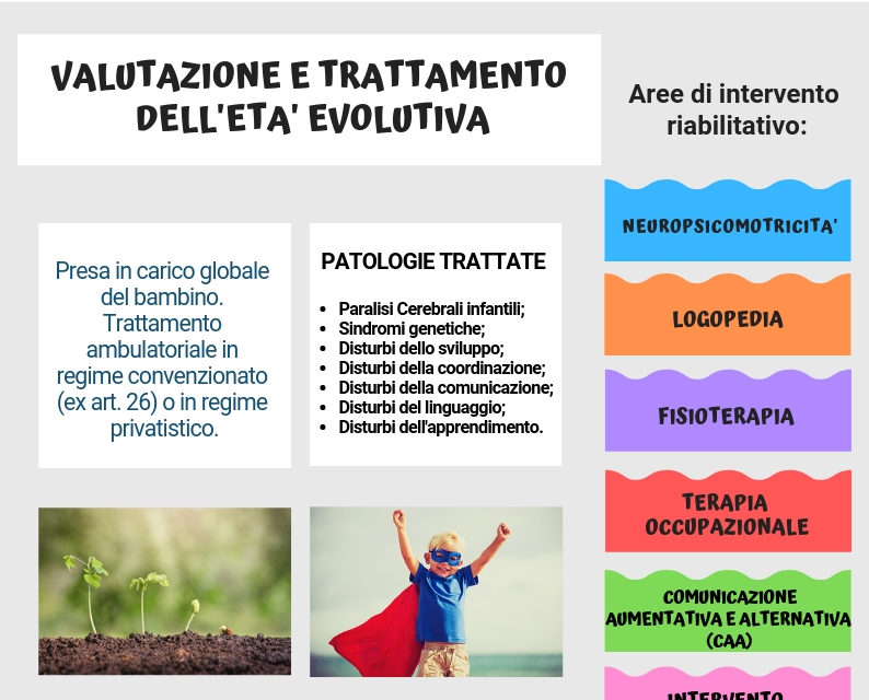 Tutte le informazioni relative alla valutazione e trattamento dell’età evolutiva sono presenti nella grafica. Per ulteriori informazioni, contattateci.